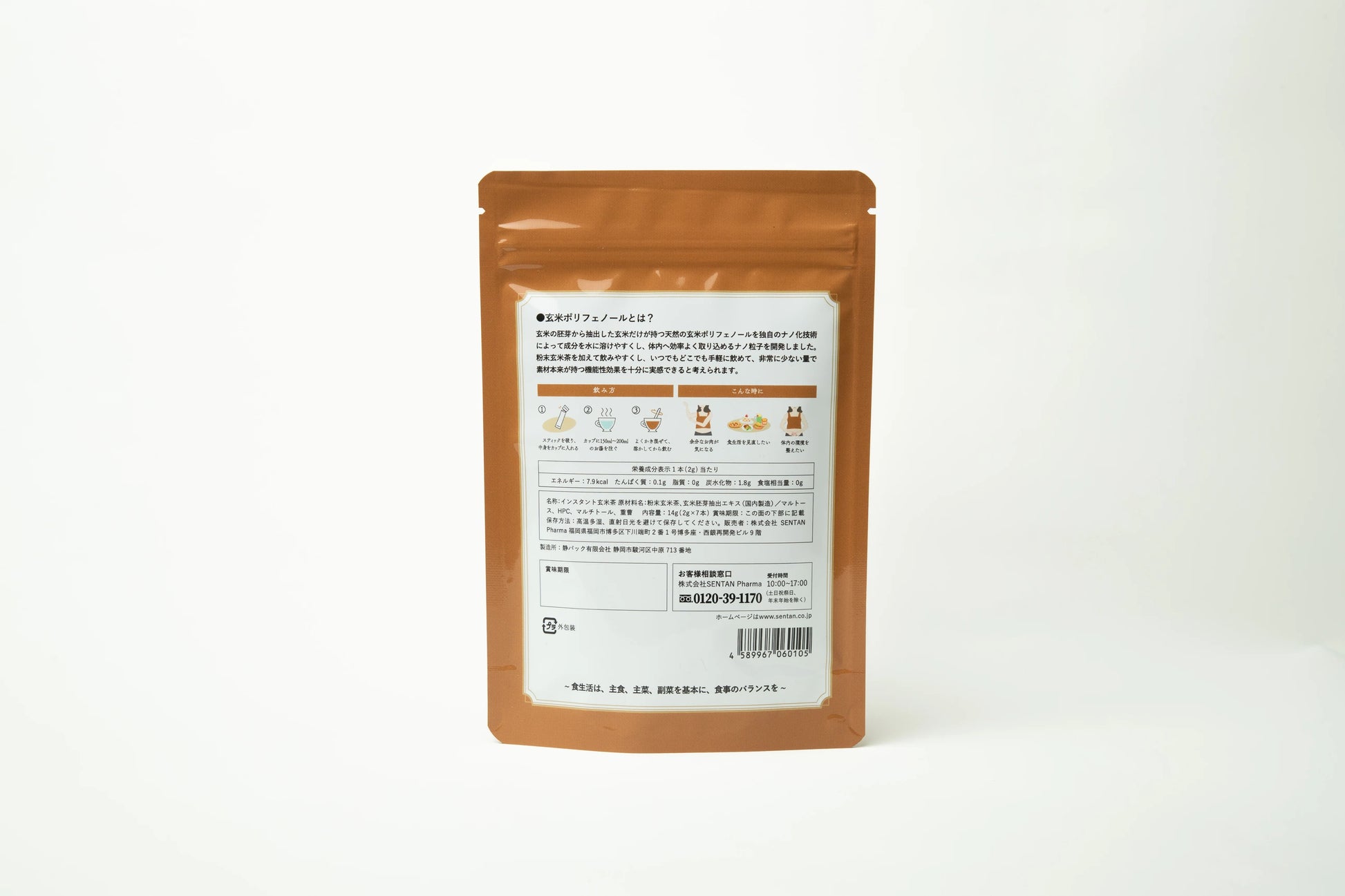 玄米の胚芽から抽出した玄米だけが持つ天然の玄米ポリフェノールを独自のナノ化技術 によって成分を水に溶けやすくし、 体内へ効率よく取り込めるナノ粒子を開発しました。 粉末玄米茶を加えて飲みやすくし、 いつでもどこでも手軽に飲めて、 非常に少ない量で 素材本来が持つ機能性効果を十分に実感できると考えられます。